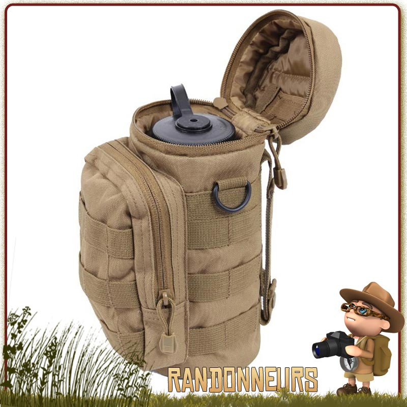 Pratique et facile de mise en place, ce porte gourde et bouteille type Nalgene, léger et robuste, permet de transporter une gourde randonnée et militaire sur un sac à dos armée grâce au système de fixation MOLLE. Pochette zippée frontale pour le rangement de son petit matériel et accessoires