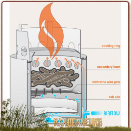 L'air, entre par les grands trous situés à la base du réchaud Solo Stove, qui s'engouffre par aspiration (différences entre l'air frais extérieur et l'air chaud intérieur), assure tout d'abord, l'oxygénation du foyer, qui se trouve sur la grille interne. Les cendres ne risquent pas d'obturer cette dernière, du fait qu'elles sont récupérées dans le réceptacle situé juste en dessous. Ce système permet de brûler plus rapidement le combustible organique, même s'il est humide.